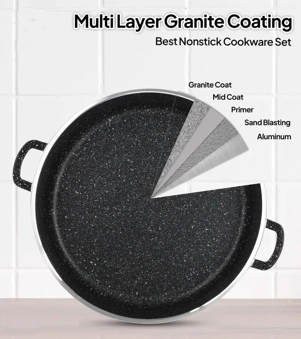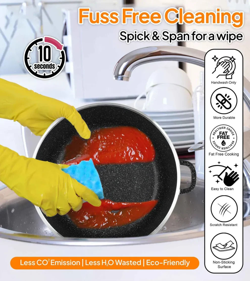 - -Durable Non-Stick Cooking Pots Interior Surface Crafted From A Granite Non-Stick Coating; Making It Easy To Clean And Minimizes Chances Of Food Sticking To The Surface. The Coating Shall Make It More Durable And You Will No -Longer Have To Worry About Any Staining Or Permanent Residues. The Non-Stick Surface Will Allow You To Cook With Minimum Amount Of Butters/Oils/Fats, Making Food Much Healthier